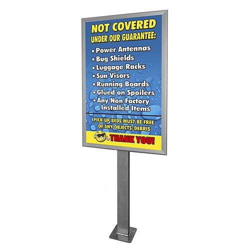 Communicate important information or advertise to your customers using this pedestal-mounted frame. It features a snap-open frame that allows you to switch out signs with ease. The frame measures 28 inches x 44 inches and it accepts signs with those same dimensions. Aluminum is used to construct the frame and pedestal to make it lightweight and durable. Plus, it has 32" of ground clearance making it tall enough for customers sitting in their vehicles to see.